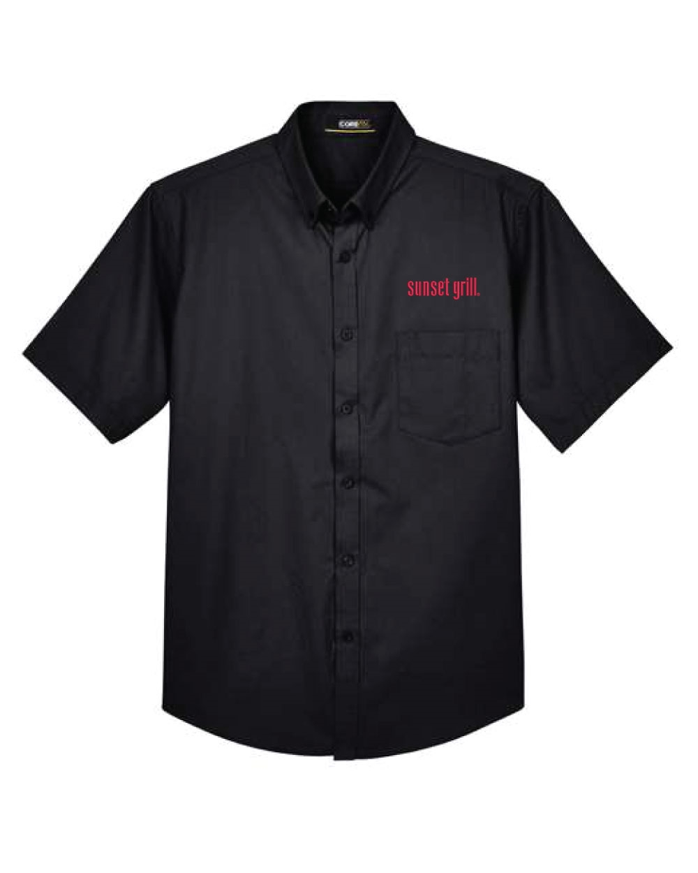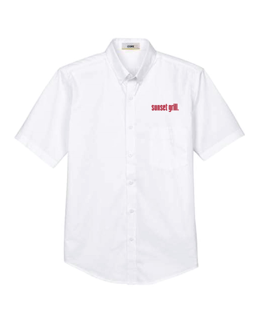 7.5-oz, 55/45 cotton/polyester. Left chest pocket with button down collar. Sunset Grill logo is embroidered.